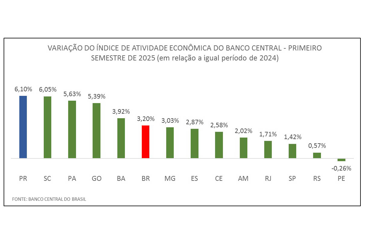 Com um avanço de 6,1% nas atividades econômicas no primeiro semestre de 2025, o Paraná lidera o crescimento econômico anual os estados. O desempenho estadual também é praticamente o dobro do Brasil no mesmo período, cuja variação foi de apenas 3,2%, segundo dados divulgados pelo Banco Central e analisados pelo Instituto Paranaense de Desenvolvimento Econômico e Social (Ipardes).